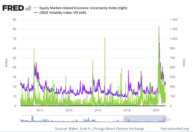 The recent economic uncertainty index spike was stronger and longer lasting than usually. The index decay suggests that there should be a corresponding decline in market option volatility as seen in the VIX. As long as the uncertainty is declining, the VIX should follow the same pattern.